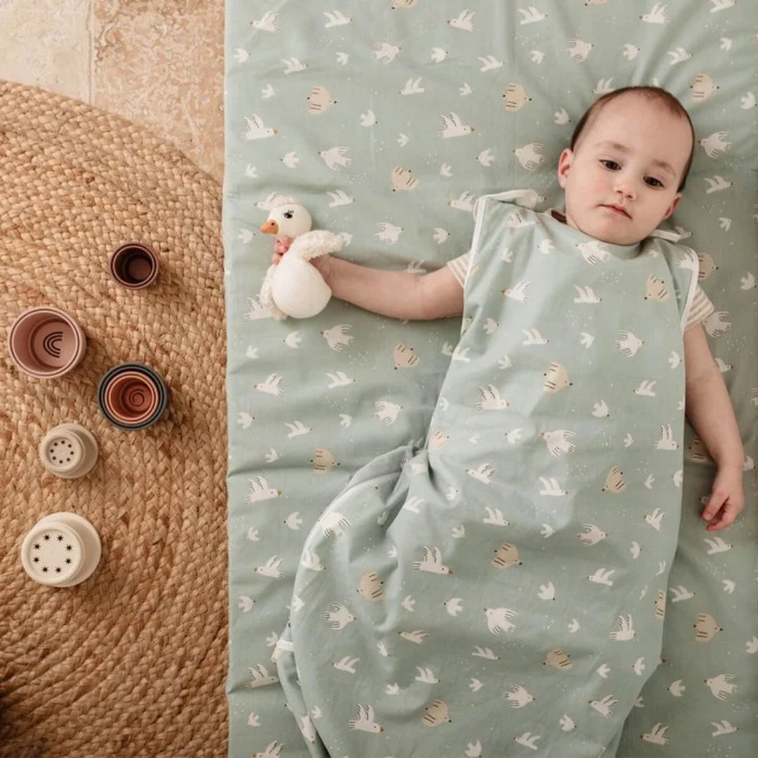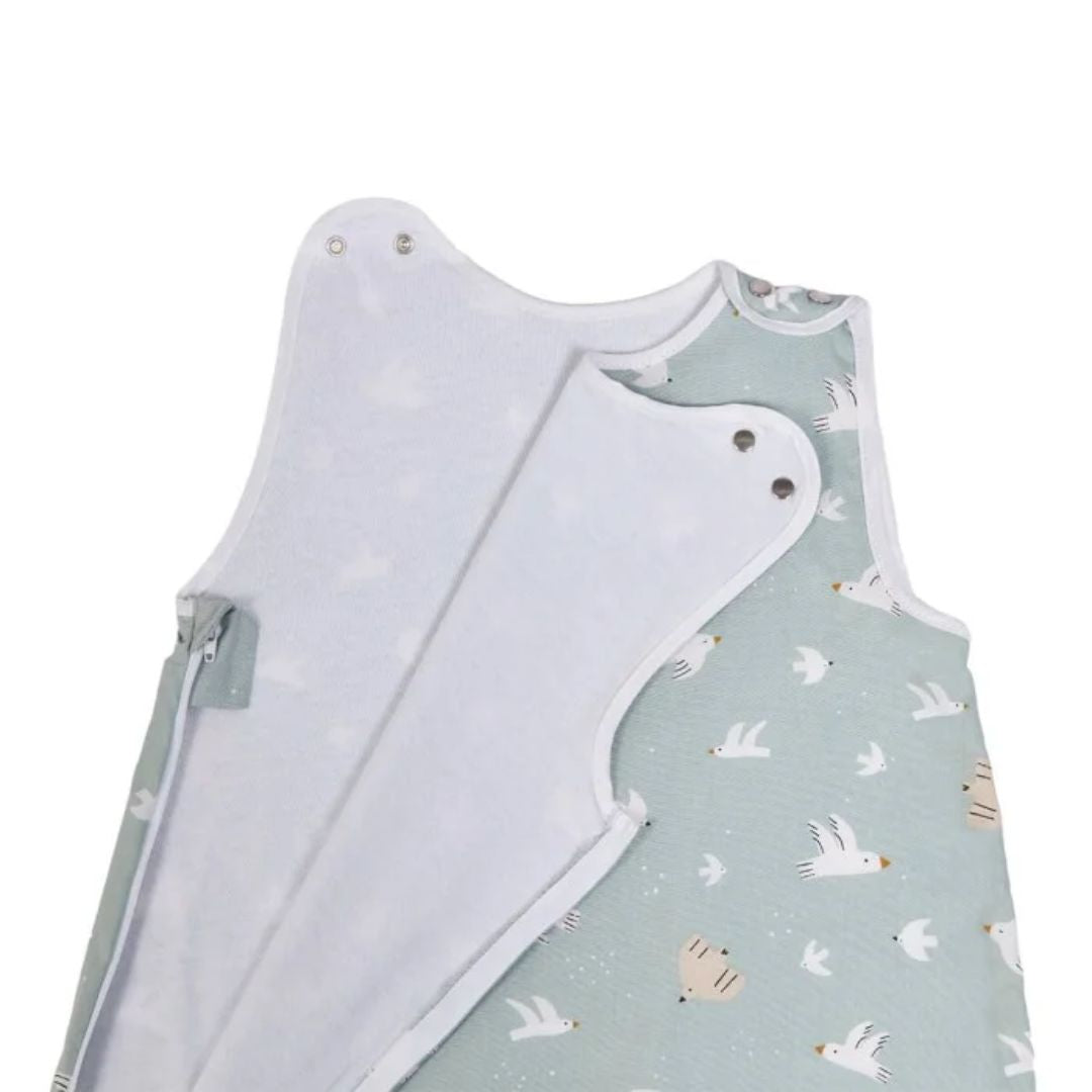 The Candide Summer Sleeping Bag - Over the Sea is designed for children aged 9 to 36 months, providing comfort and adaptability for warm summer nights.