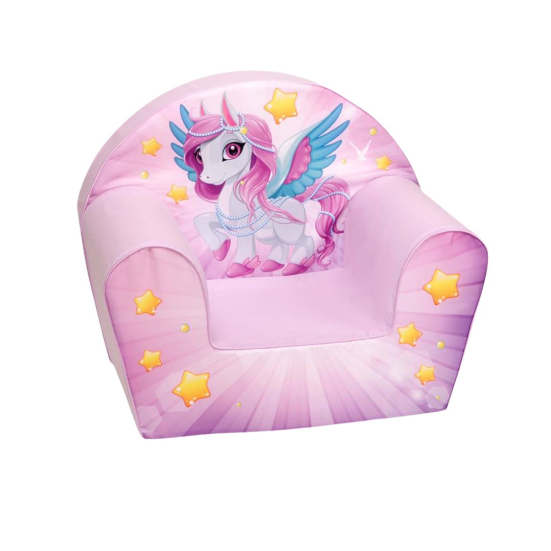 The Delsit Armchair Unicorn is a whimsical and safe seating option for children aged 9 months to 5 years, designed from soft and lightweight foam for easy handling.