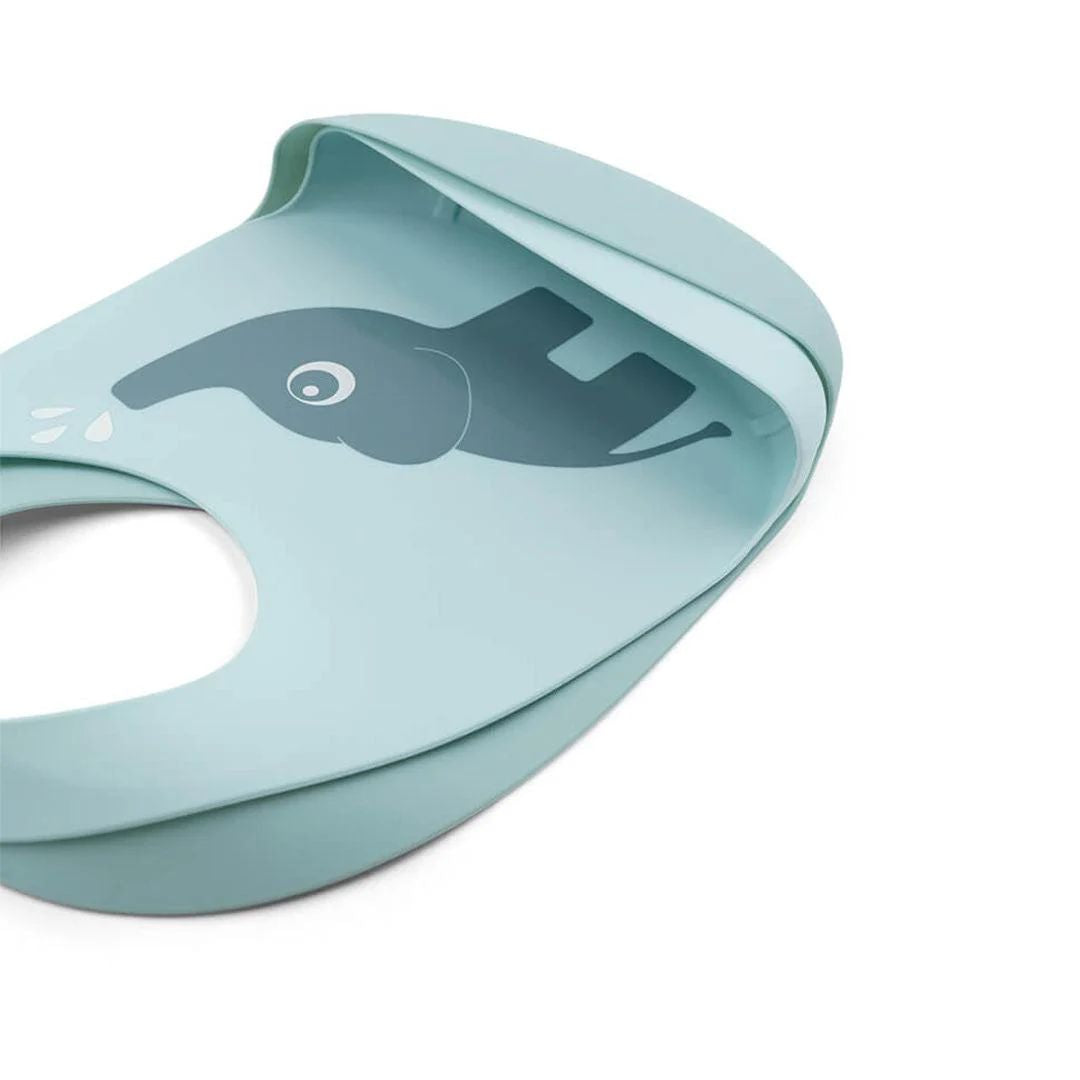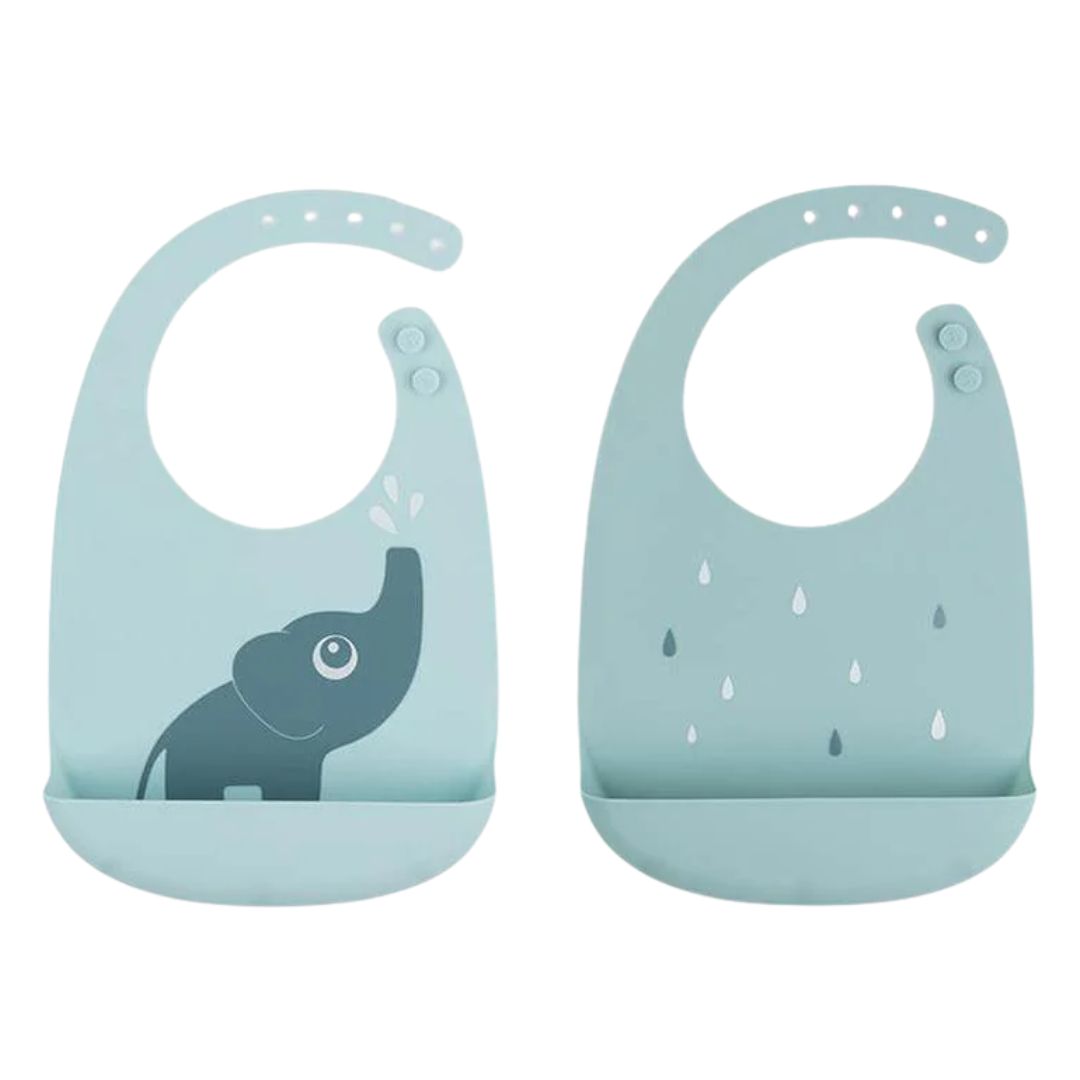 The Done by Deer Silicone Bib - Elphee - Blue - 2 Pack offers a practical and stylish solution for mealtimes. Designed with a charming Elphee motif, this set includes two waterproof bibs that are soft and comfortable for young children. The adjustable neck strap ensures a secure fit, while the front pocket effectively catches any food that may fall, helping to keep the dining area clean. These bibs are easy to maintain, either by wiping them down or washing them in the dishwasher.