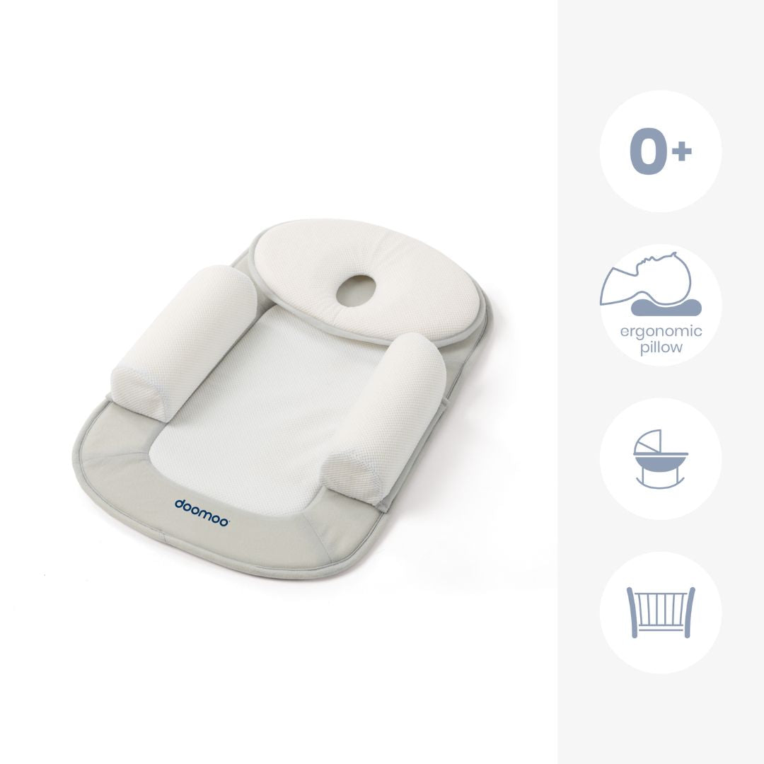 The Doomoo Multi Sleep Back Positioner with Head Pillow is designed to prevent flat head syndrome by supporting your baby in a safe, ergonomic back-sleeping position from birth to 3–4 months. It ensures proper head positioning and comfort with adjustable side rolls and a ventilated head cushion, ideal for use in all sleep settings.
