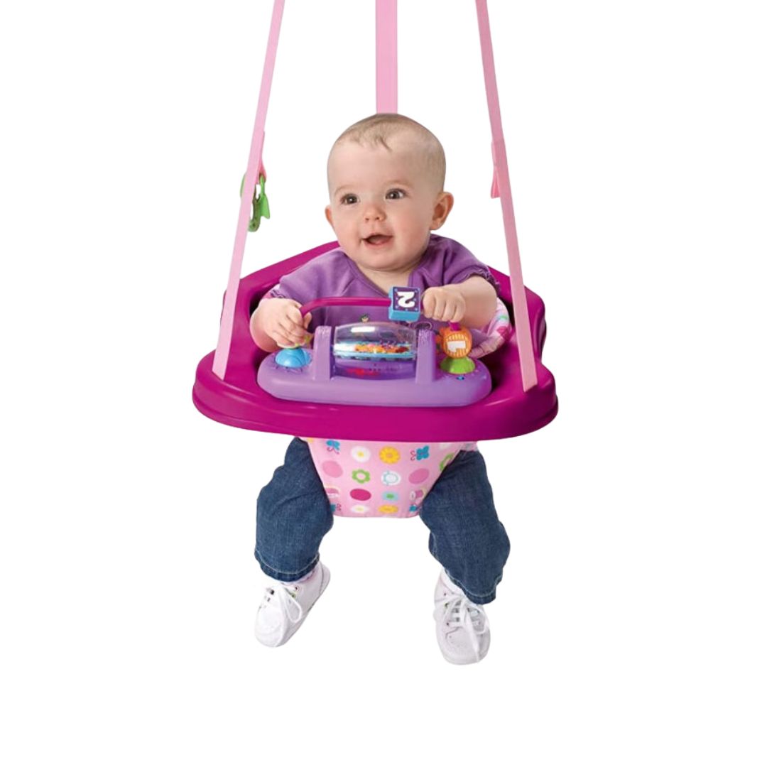 The Evenflo Jump & Go Exersaucer Door Jumper in purple is designed for children from 4 months to walking age, with a maximum weight limit of 11 kg. This jumper features a spring with a plastic casing to prevent tangling, along with an interactive development center that includes sound and light effects.