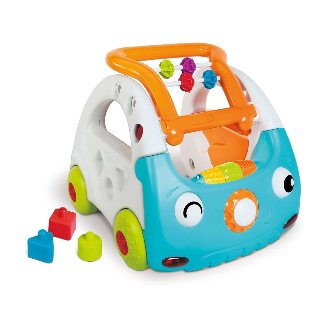 - Low position for sitting play with locked wheels, featuring shape-fitting activities and a ball ramp