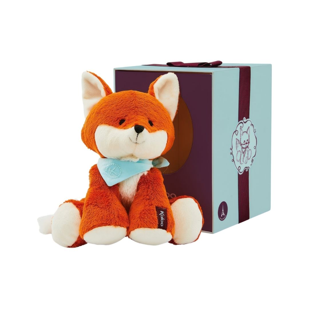 Kaloo Paprika the Fox Cub, a delightful plush toy featuring a musical function. Babies will be soothed to sleep by the calming melody of "Rock-a-Bye Baby," activated by simply pulling its tail. With its adorable face and soft fur, this 17 cm plush is the perfect companion for comforting cuddles, made with stuffing from recycled polyester.