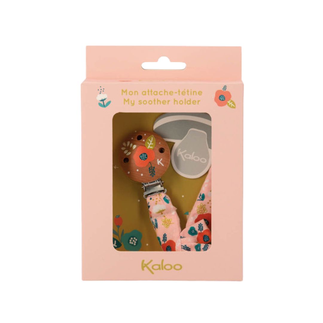 The Kaloo Pacifier Clip Poppy is a stylish 16.5 cm soother holder made from peach fabric and cotton muslin. Its printed poppy-coloured wooden hook adds a delicate touch, making it a perfect gift for a newborn.