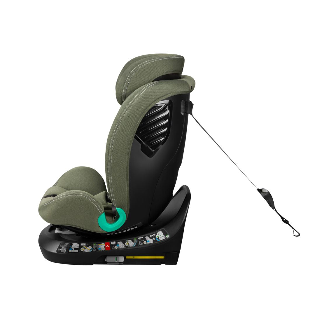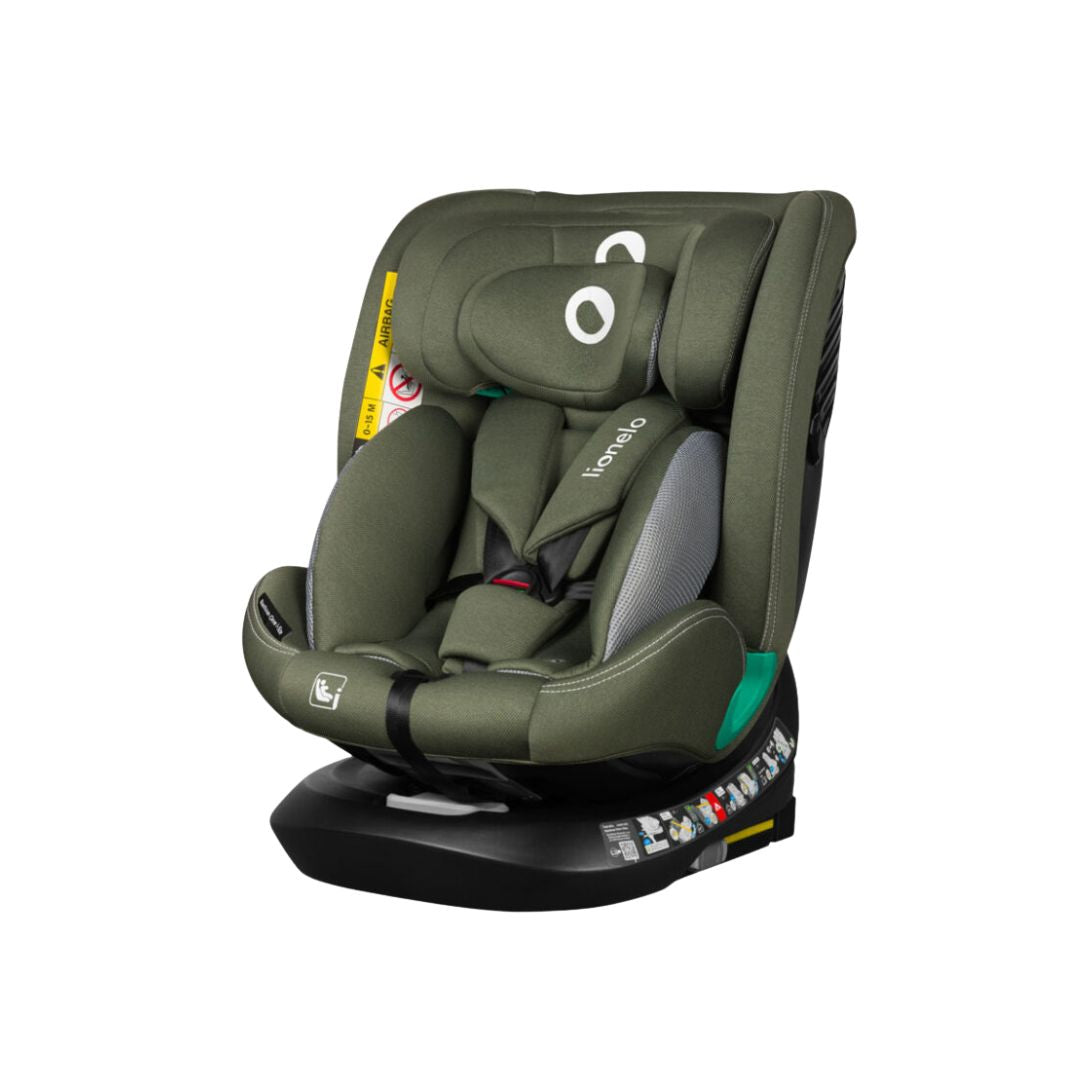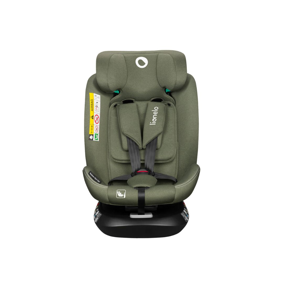 The Lionelo Bastiaan One i-Size Car Seat in Green Olive is designed for children from 40 to 150 cm, offering advanced safety features and versatile installation.