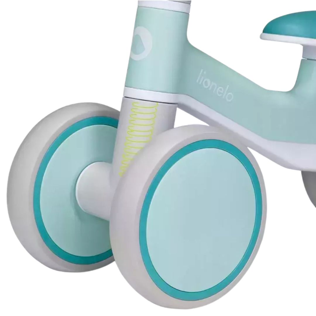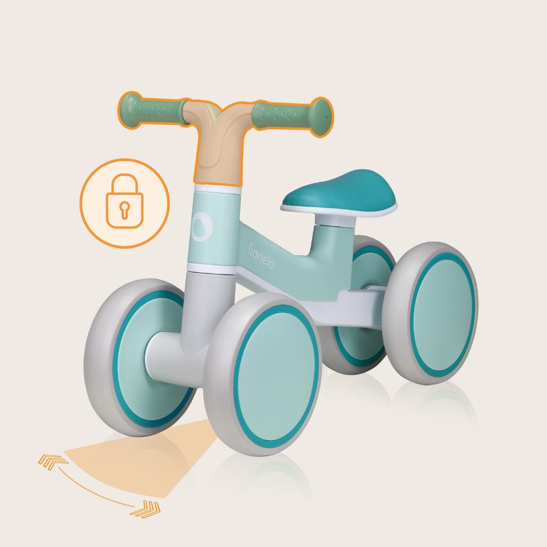 The Lionelo Villy Balance Bike is tailored for children aged 1 and older, featuring shock absorption and a stable four-wheel design to enhance safety and comfort during rides. This four-wheeled bike is ideal for exploration and aids in developing coordination and motor skills, making it suitable for both indoor play and outdoor adventures.