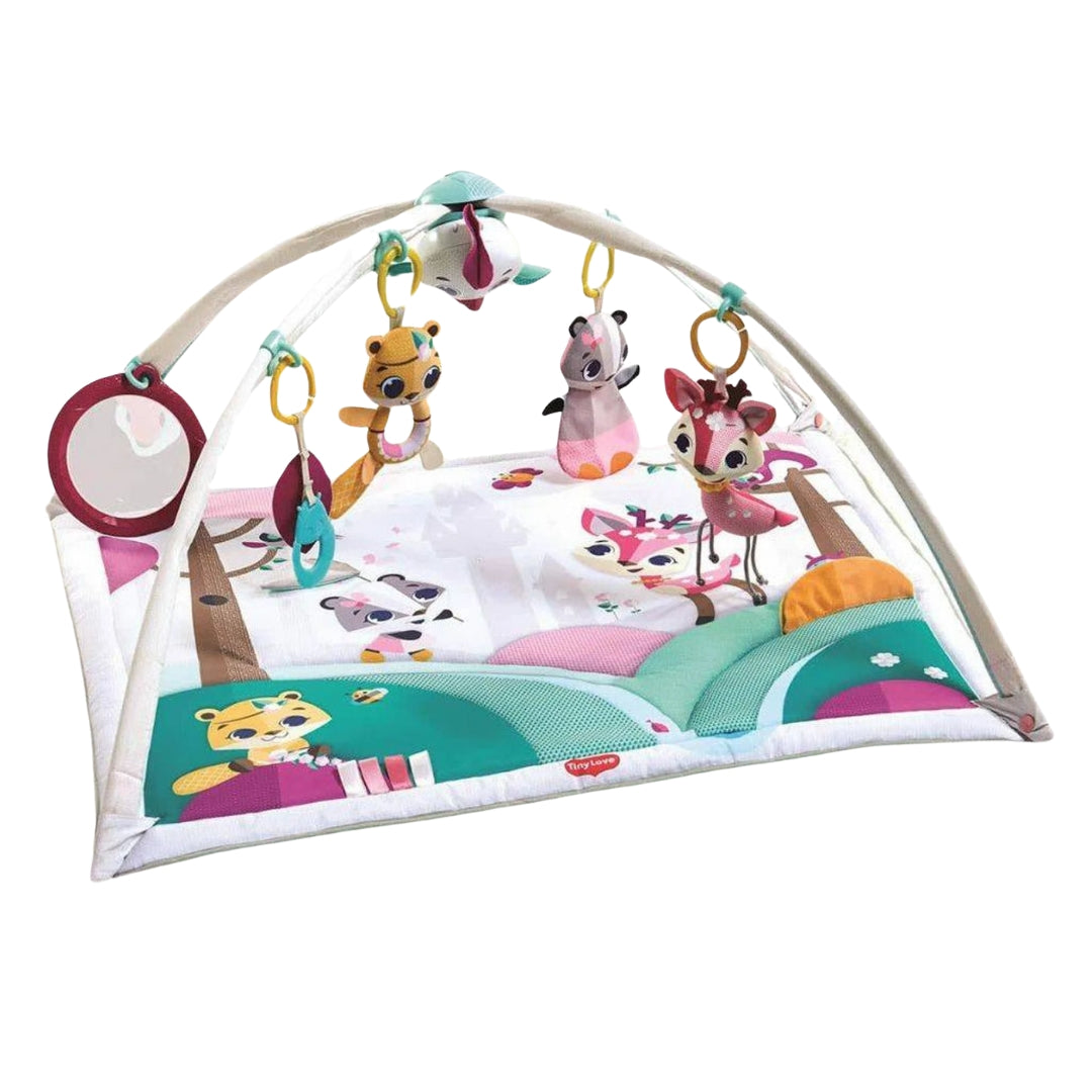 The Tiny Love Gymini Deluxe is a versatile dual-position baby gym, baby play mat from the Tiny Princess Tales collection, designed to enhance your baby's development through engaging play. With adjustable arches and interactive features, it promotes physical, cognitive, and sensory development in a beautiful forest-themed setting.