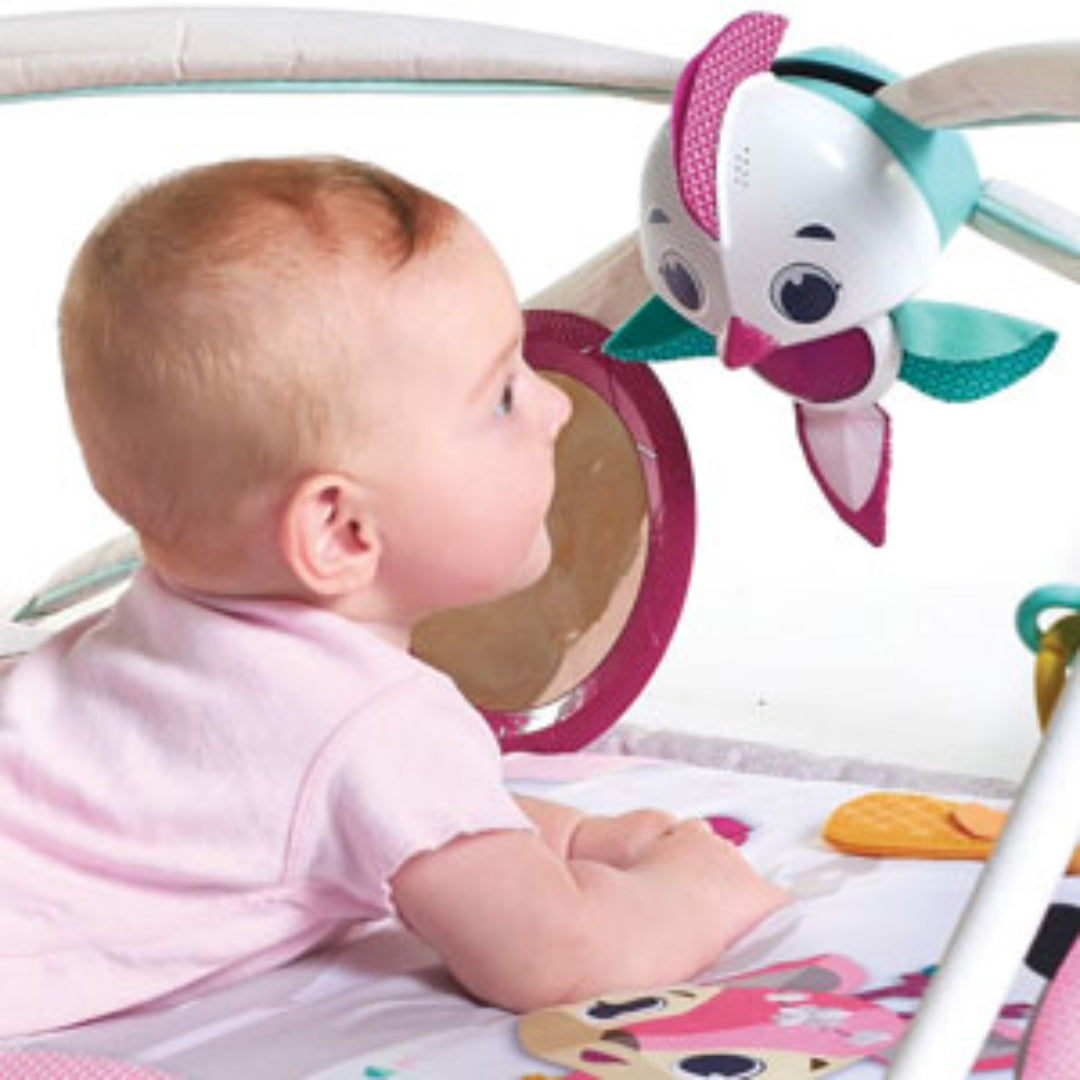 - Supports gross motor skills through tummy time with a mirror