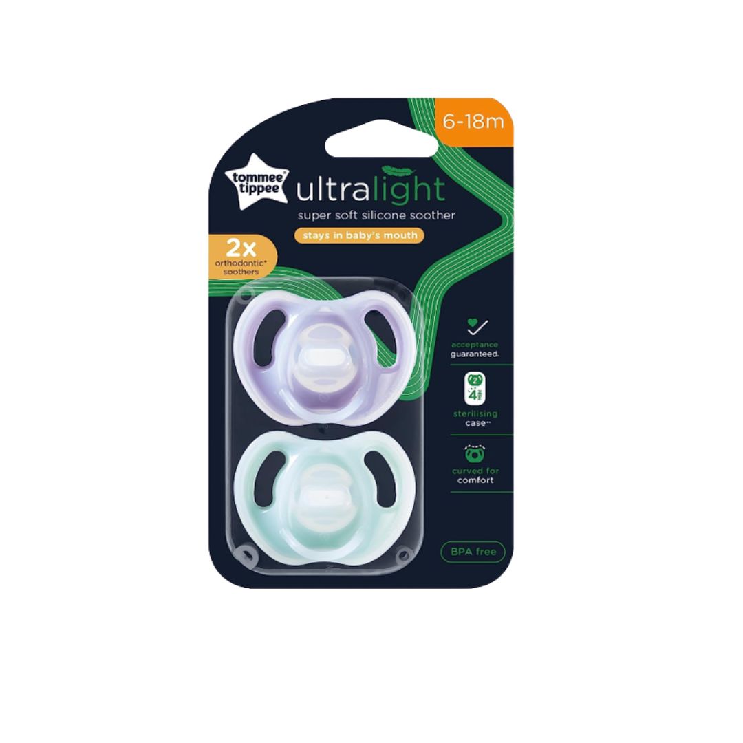 The Tommee Tippee UltraLight Soothers (6-18m, Pack of 2) are designed for comfort and convenience, providing a soothing experience for babies.