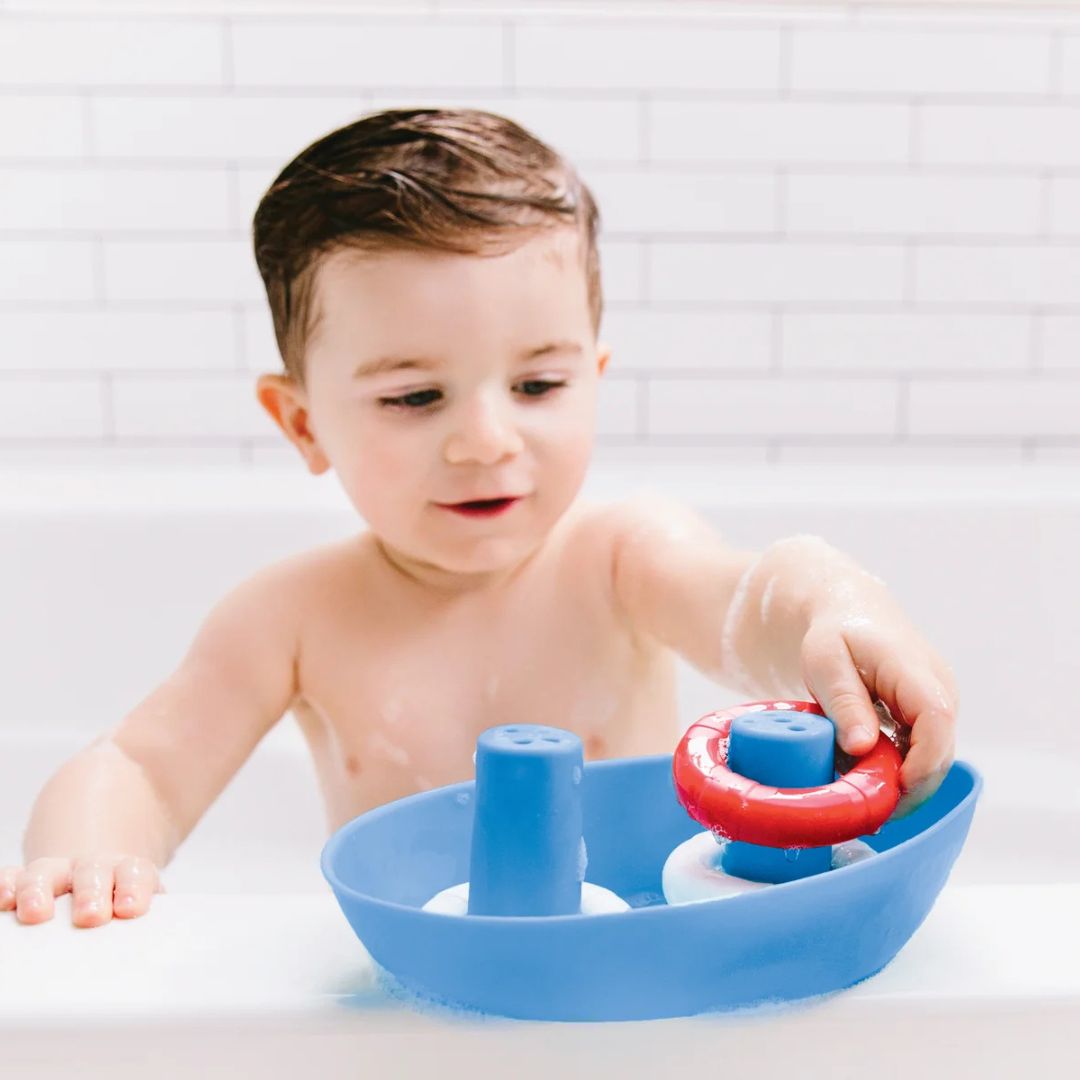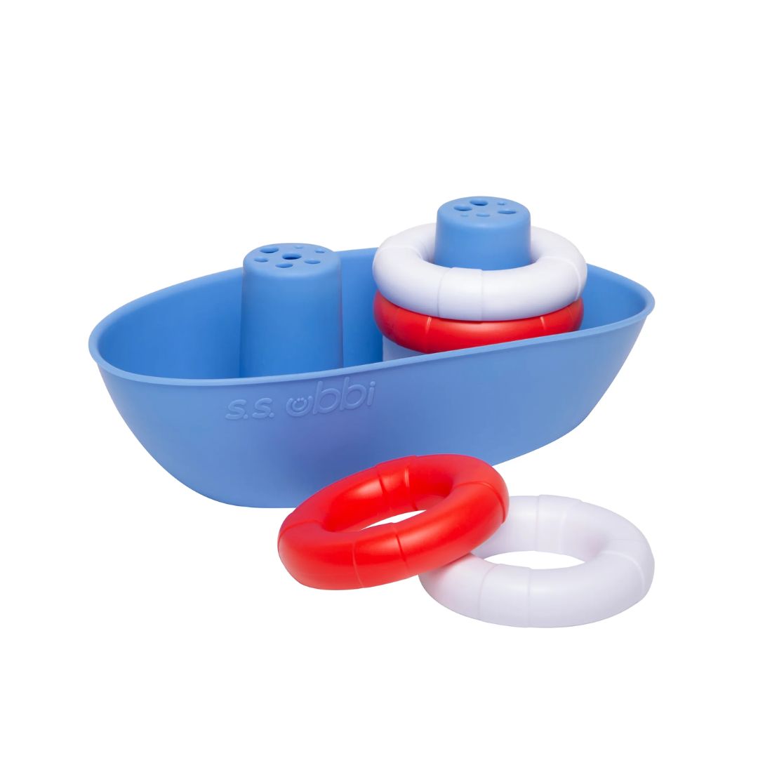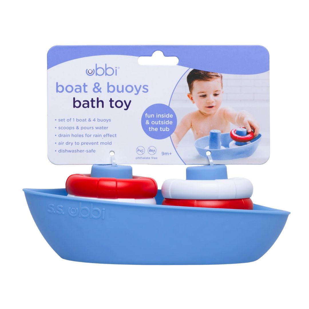 The Ubbi Boat & Buoys Bath Toys Set includes 1 boat and 4 buoys, designed to make bath time fun and interactive for toddlers. The soft silicone boat scoops and pours water through drain holes, creating a delightful rain effect. The set encourages hand-eye coordination while promoting imaginative play as little ones stack the red and white buoys on the two funnels.
