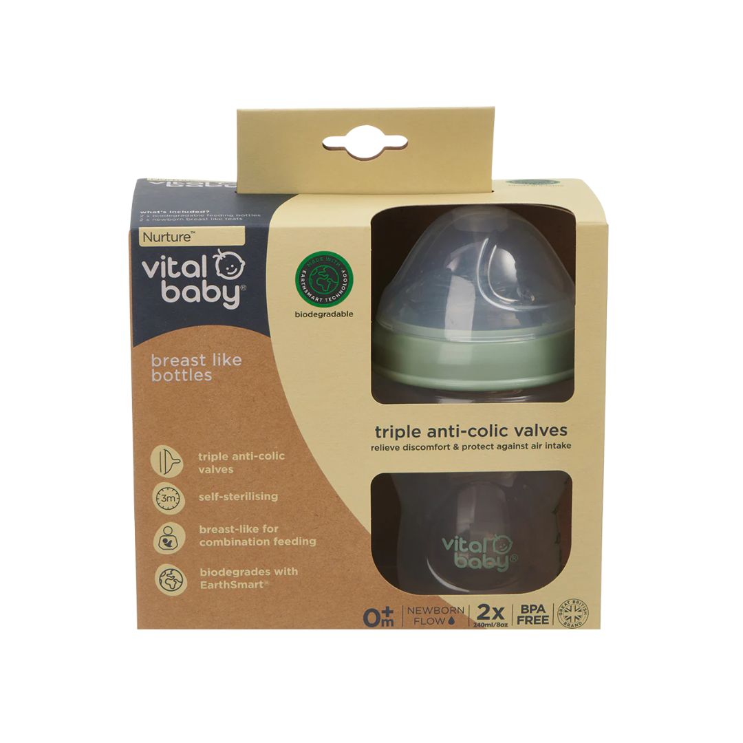 The Vital Baby is A 2-pack of 240ml breast-like baby bottles designed to support natural latching, reduce colic, and simplify cleaning with self-sterilising functionality.