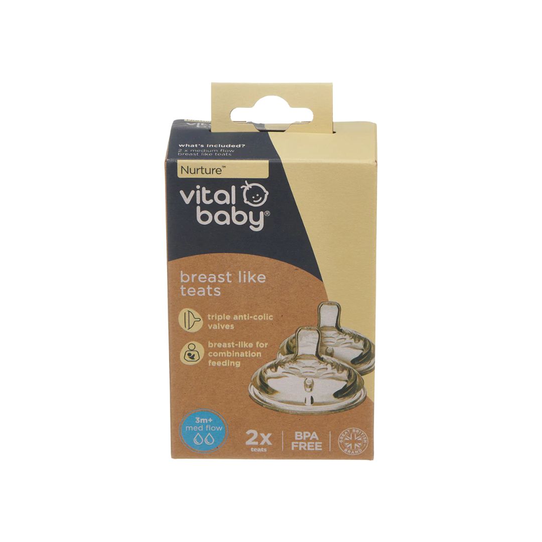 This Vital Baby Nurture like breast Medium flow is a 2-pack of expertly designed breast-like teats with Flexzone movement and anti-colic valves to support natural feeding and ease bottle transition.