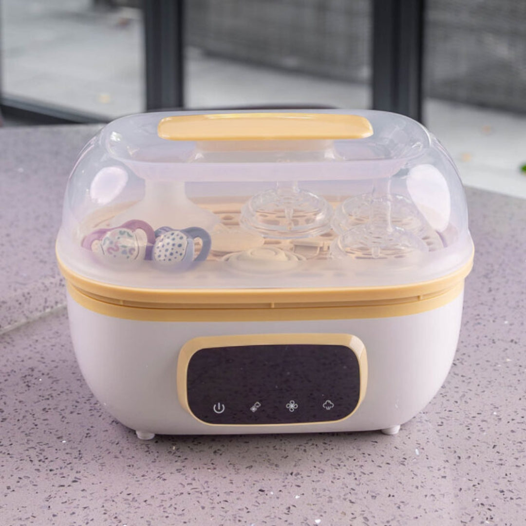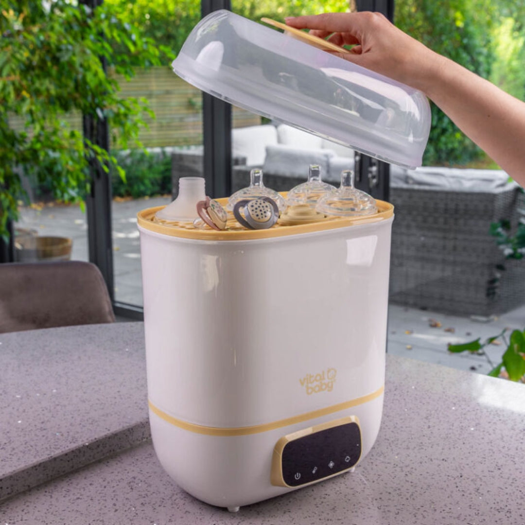 The Vital Baby Nurture Pro Steam Steriliser & Dryer effectively kills 99.9% of bacteria, viruses, and mould in just minutes. Its sleek design and versatile functionality ensure bottles and accessories are sterilized and dried quickly, without taking up much space in your kitchen.