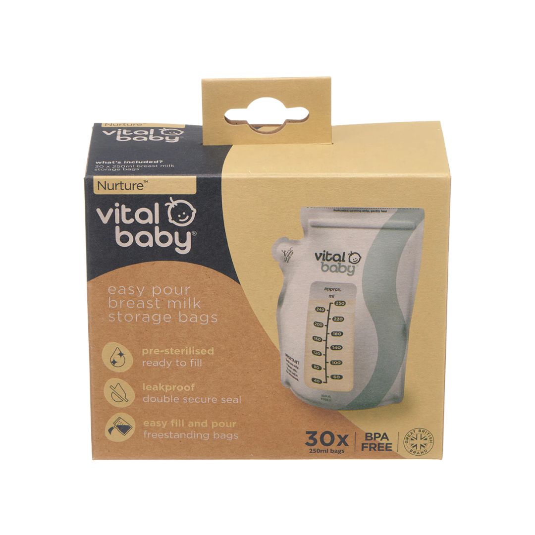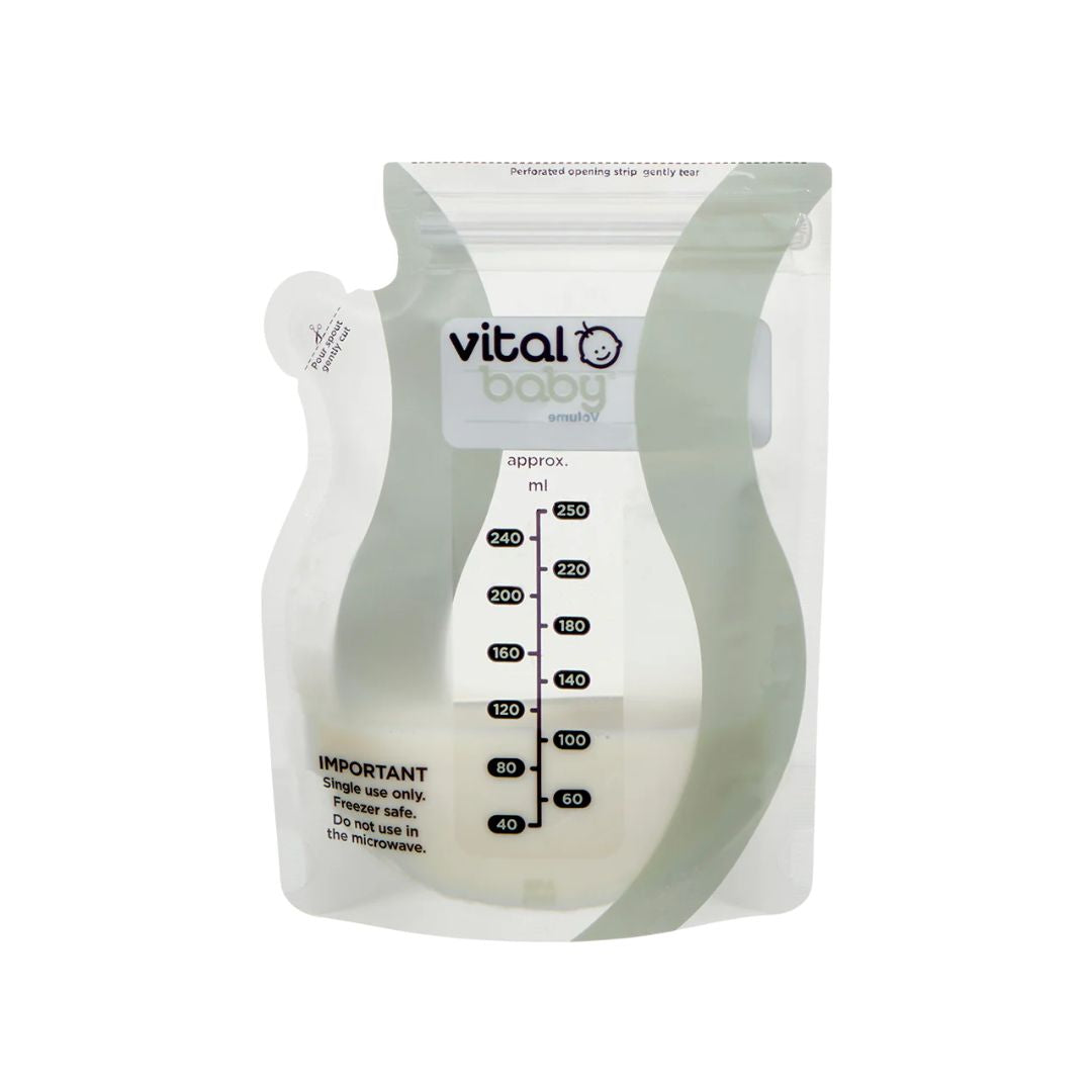 The Vital Baby Pre-sterilised breast milk storage bags designed for safe, hygienic, and convenient milk storage. With a secure double zip seal and easy-pour spout, these single-use bags ensure leak-free handling and effortless feeding prep.