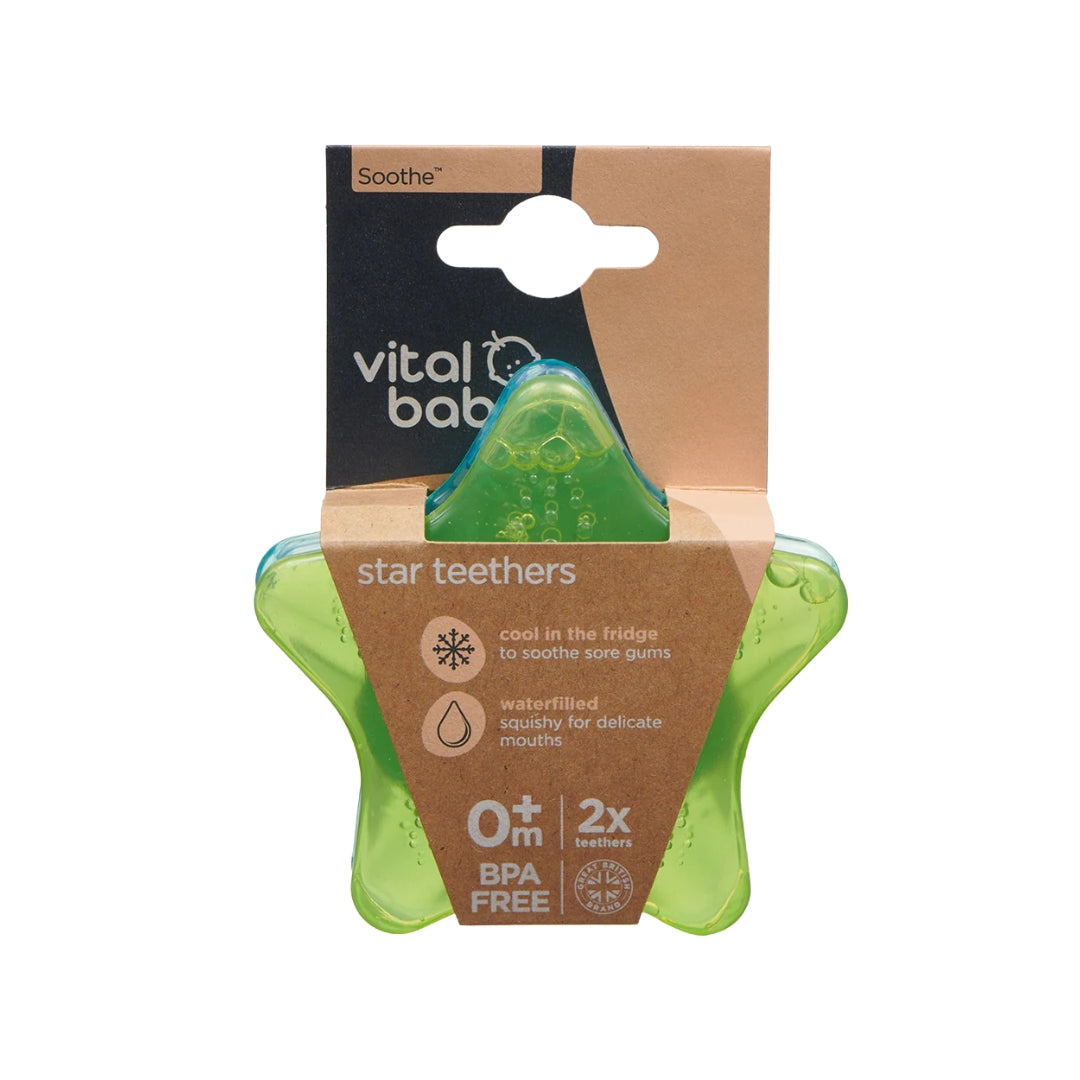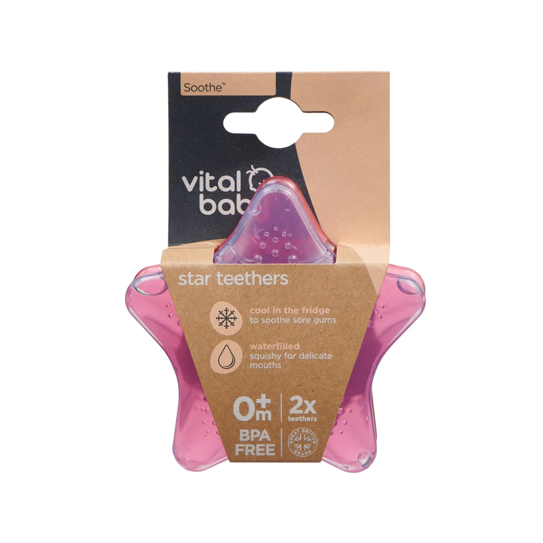 The Vital Baby Star Teethers 2pk, thoughtfully designed for early teething, these star-shaped teethers are easy to grip, coolable in the fridge, and textured to soothe sore gums. Safe to use from birth, they’re available in pink & purple or blue & green, and work with teething gels for extra relief.