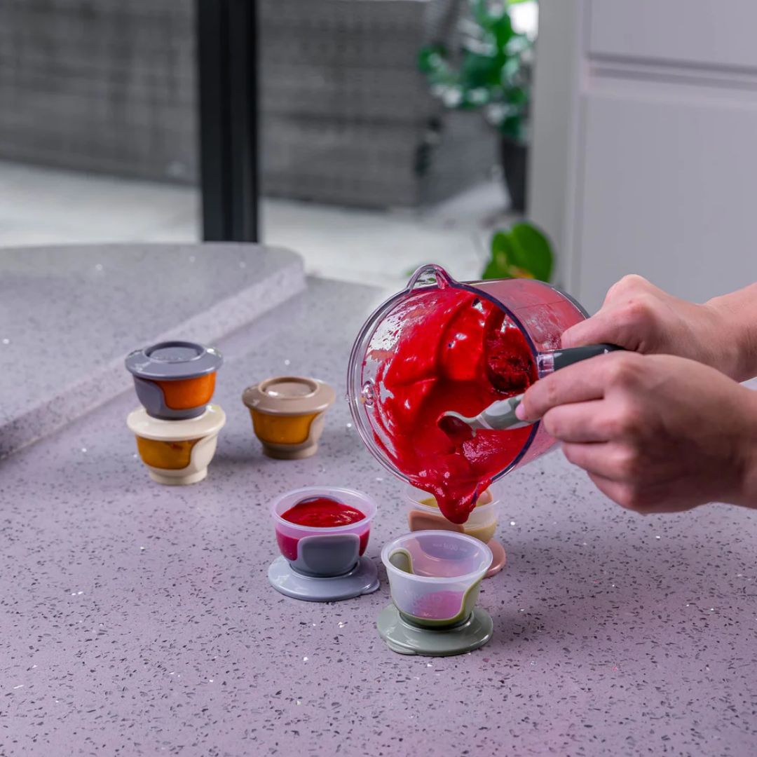 The Vital Baby Store & Wean Pots are perfectly sized for weaning and on-the-go snacks, featuring soft bases for easy food removal.