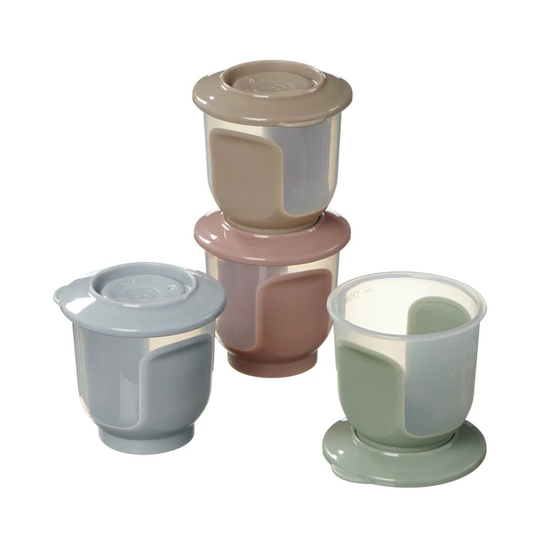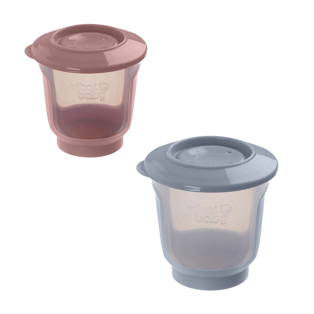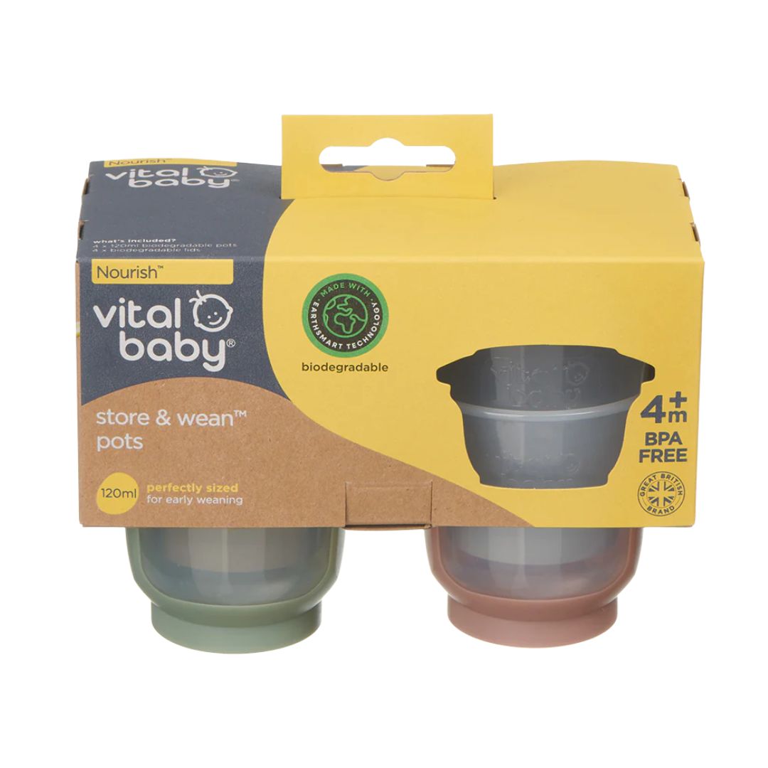 The Vital Baby Store & Wean Pots are ideal for weaning and on-the-go snacks, featuring soft bases for easy food removal.